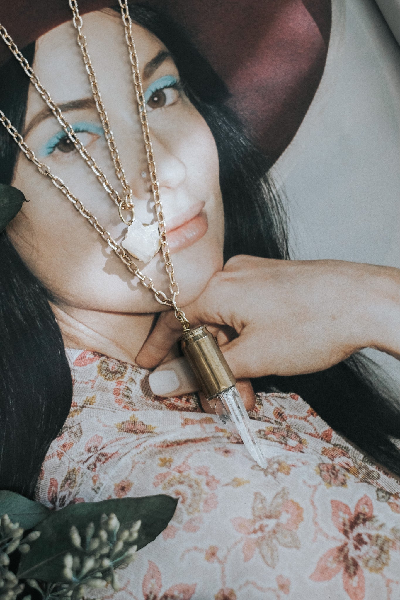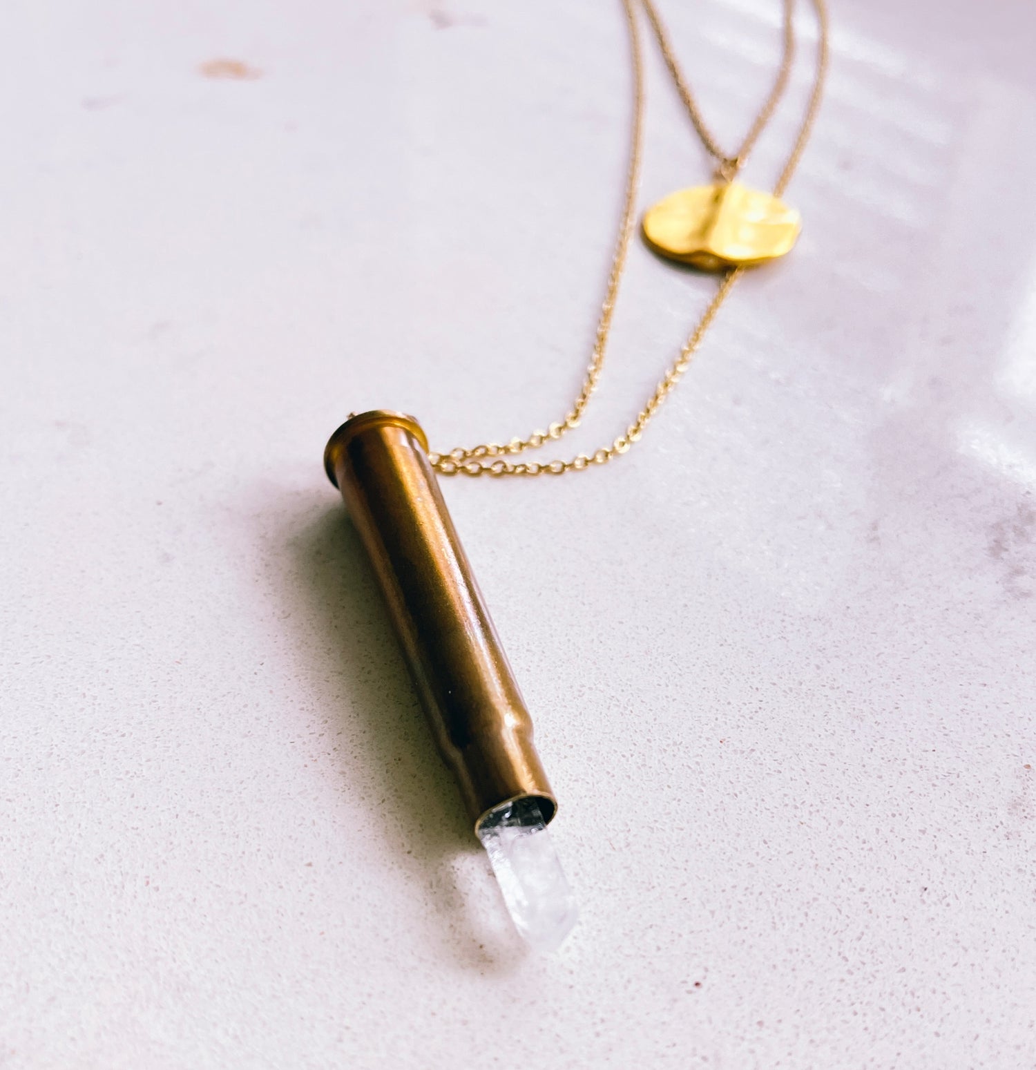 Check her outThis pendant is the representation of peace. Taking old gunshells and re-purposing them by inserting a clear quartz stone inside to give it that extra punch of positivity.